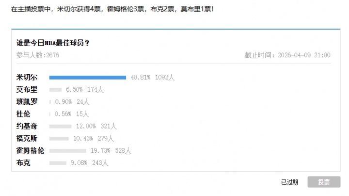 在主播投票中,米切尔获得4票,霍姆格伦3票,布克2票,莫布里1票!